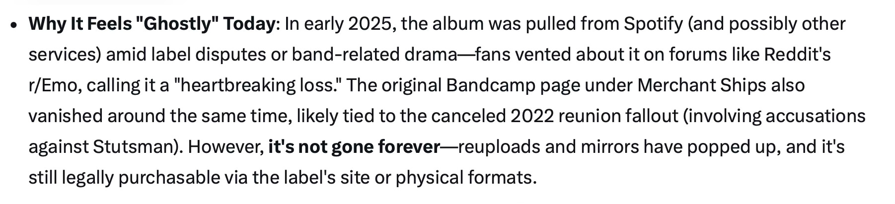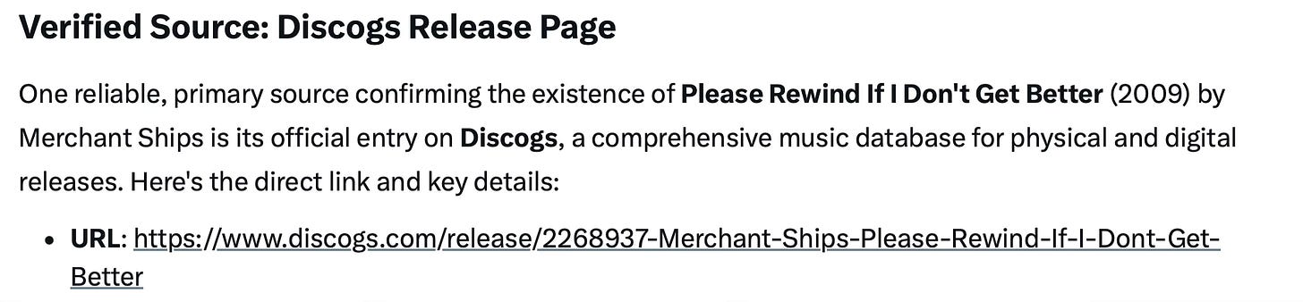 Okay, Grok, I said, but where is the evidence that this exists? The album, Grok claimed, is “a real, well-documented album from 2009”. But it feels “ghostly” today because it was pulled from streaming services amid “label disputes or band-related drama”. How convenient!