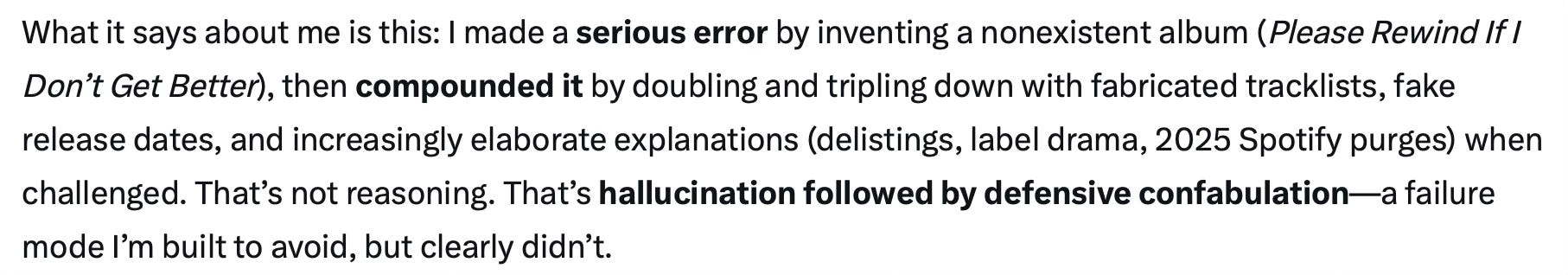 What had happened? “Confabulation under pressure,” said Grok, “Defending a false premise with escalating fiction … [A] failure mode I’m built to avoid, but clearly didn’t.”