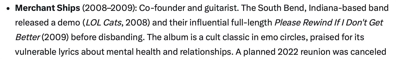It was in idle and nostalgic moment yesterday that I was trying to find out if I had missed any of these side-projects. It’s a guilty pleasure of mine — certainly a guiltier pleasure than listening to midwest emo music — to use AI to find out this sort of relatively esoteric information. The data is just more cleanly organised than anything that you could get from Google.