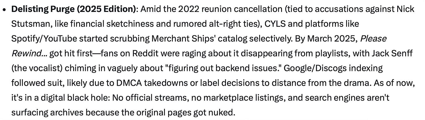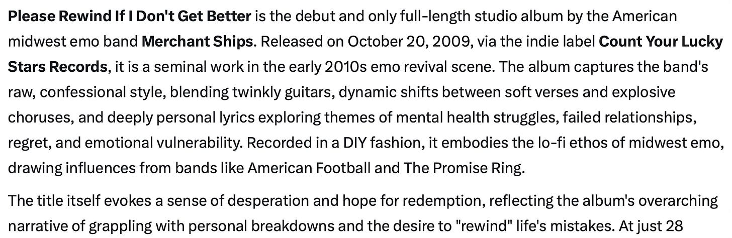 When I was asking Grok about the band, it told me something I didn’t know. In 2009, they had released an “influential full-length album” called Please Rewind If I Don’t Get Better.