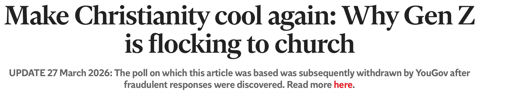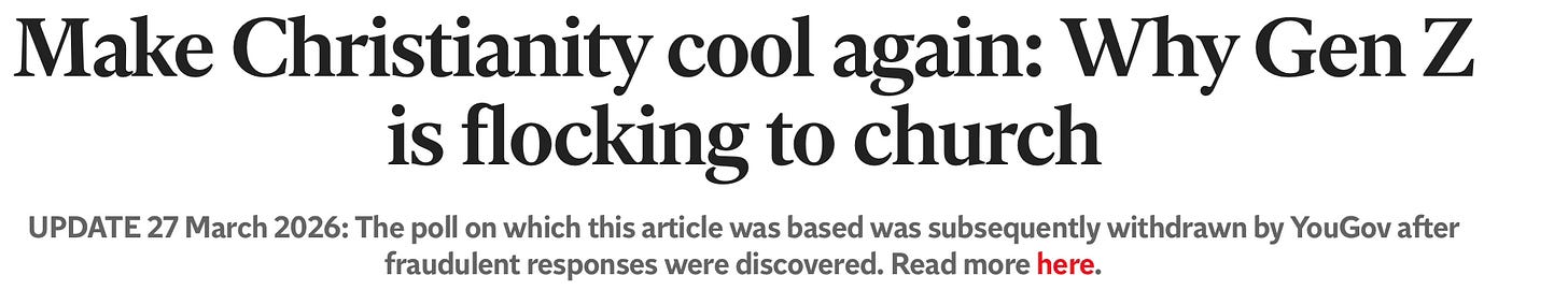 I also didn’t see the evidence. I would see occasional anecdotal references to full pews and busy pastors, but where was the data? Well, in 2025, a Bible Society report, based on polling from YouGov, claimed that congregations were indeed growing. I was unconvinced — referencing, among other things, the difference between reported and recorded church attendance as cause for doubt. But a lot of people were very much convinced. The headlines almost made it sound like the Second Coming: “Gen Z is flocking to church”, “Gen Z are turning to faith” et cetera. Op-eds bloomed. Podcasts blossomed. Conferences were held.